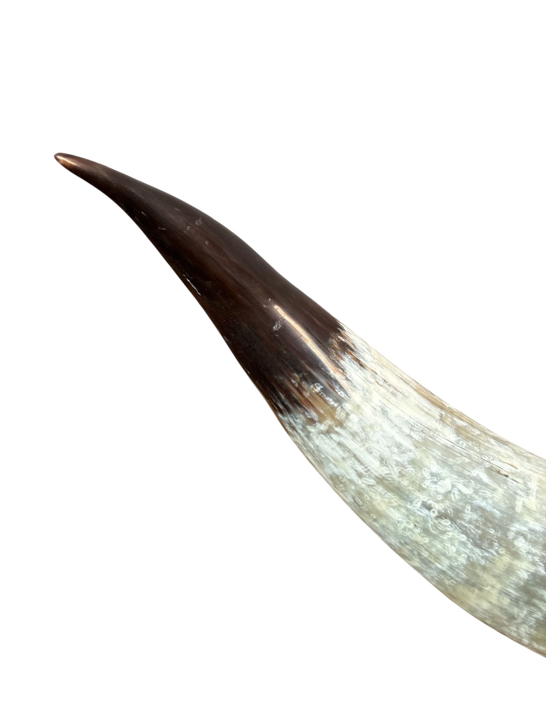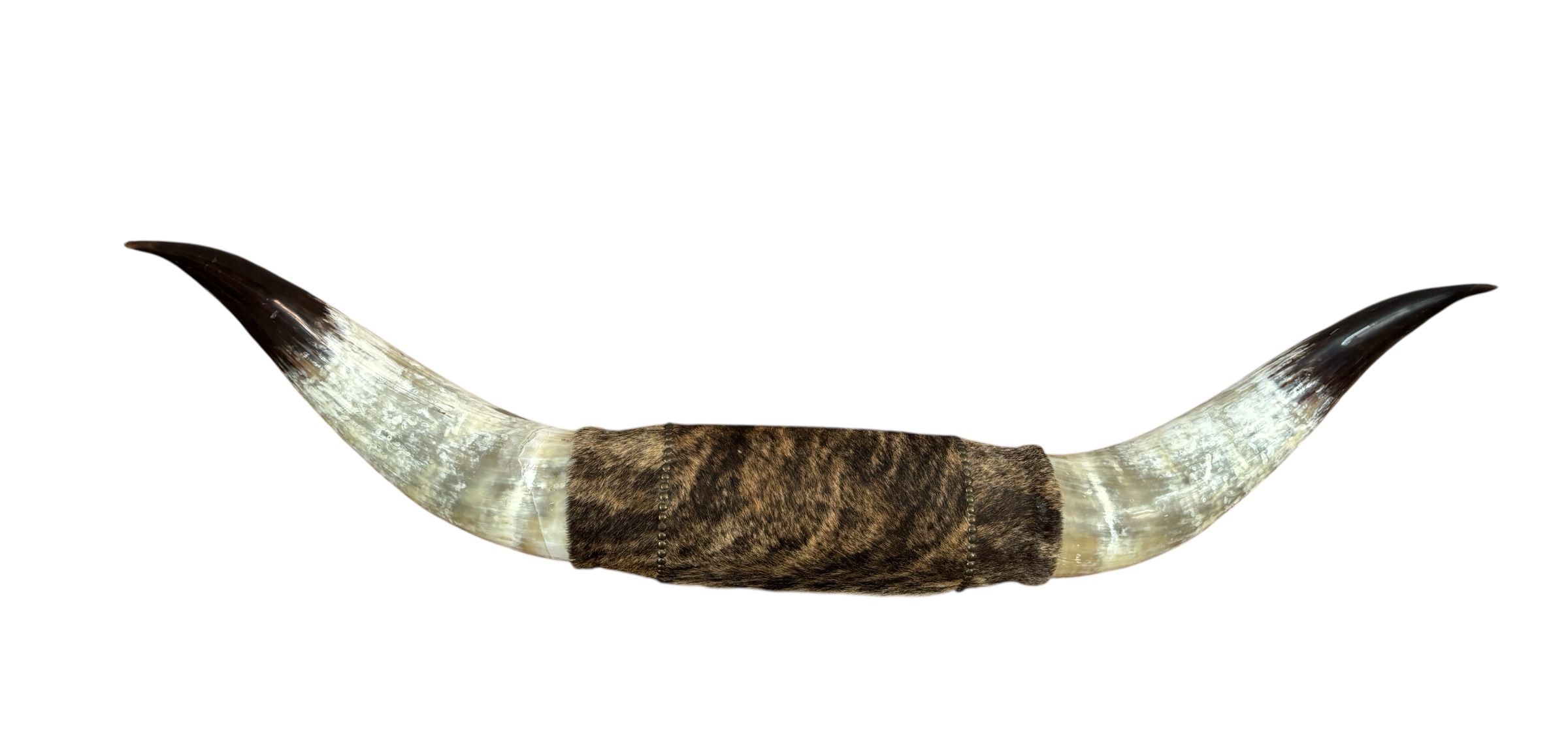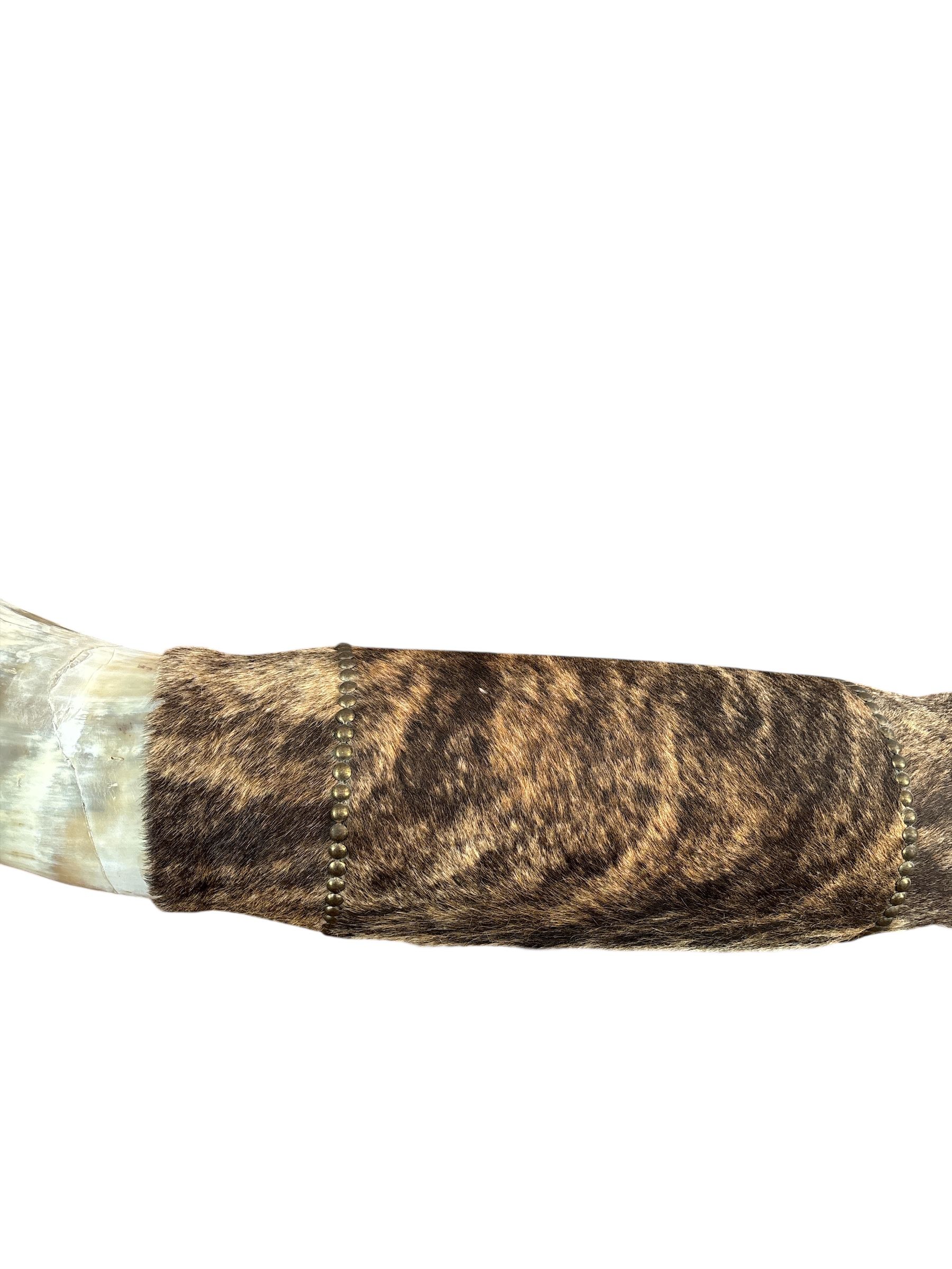 Véritable BULL HORNS fixée sur un rondin en bois et entourée d’une peau de bête