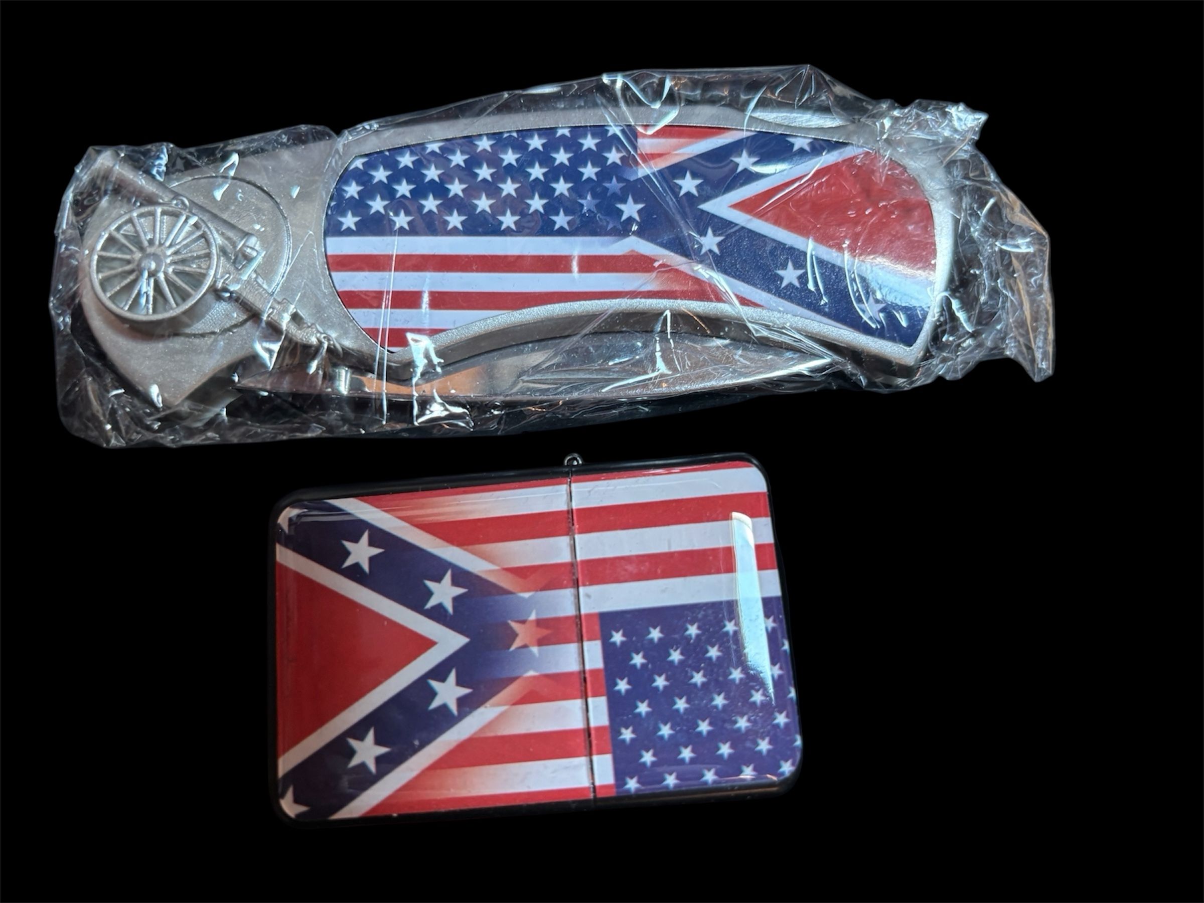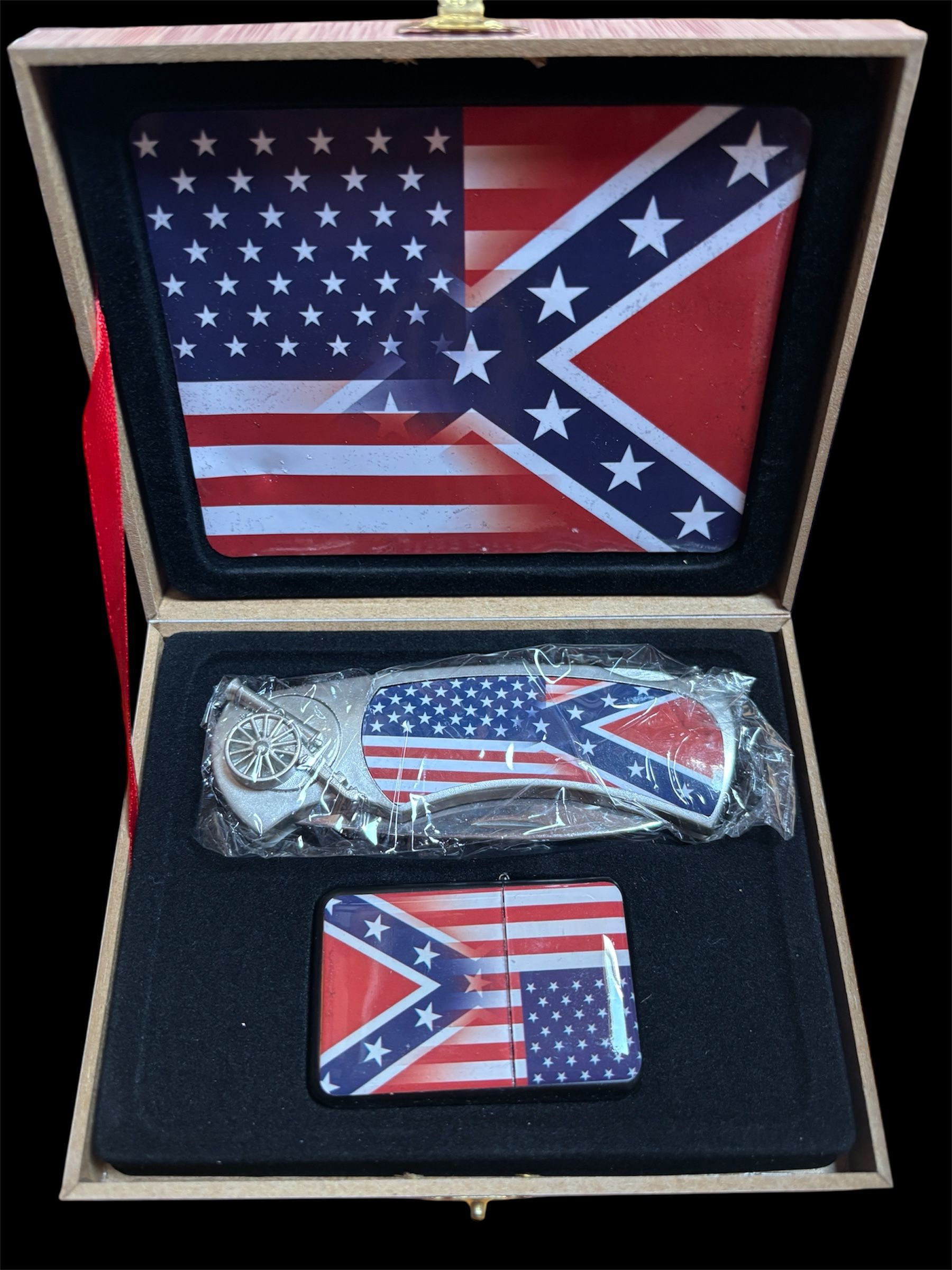 Coffret comprenant un Briquet Tempête et un couteau – USA and confédérâtes Flag