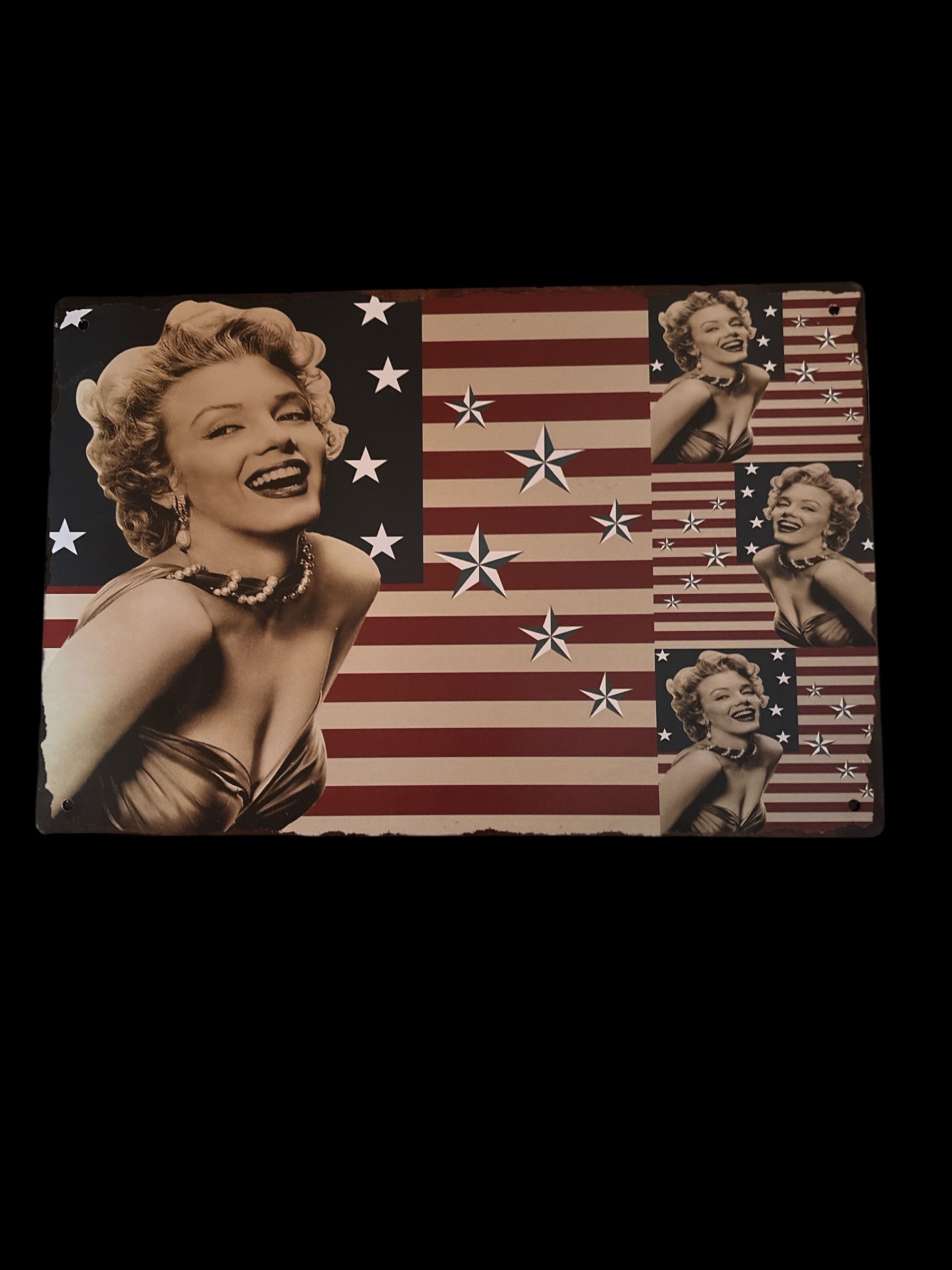 Plaque en métal MARILYN MONROE avec un fond Drapeau américain