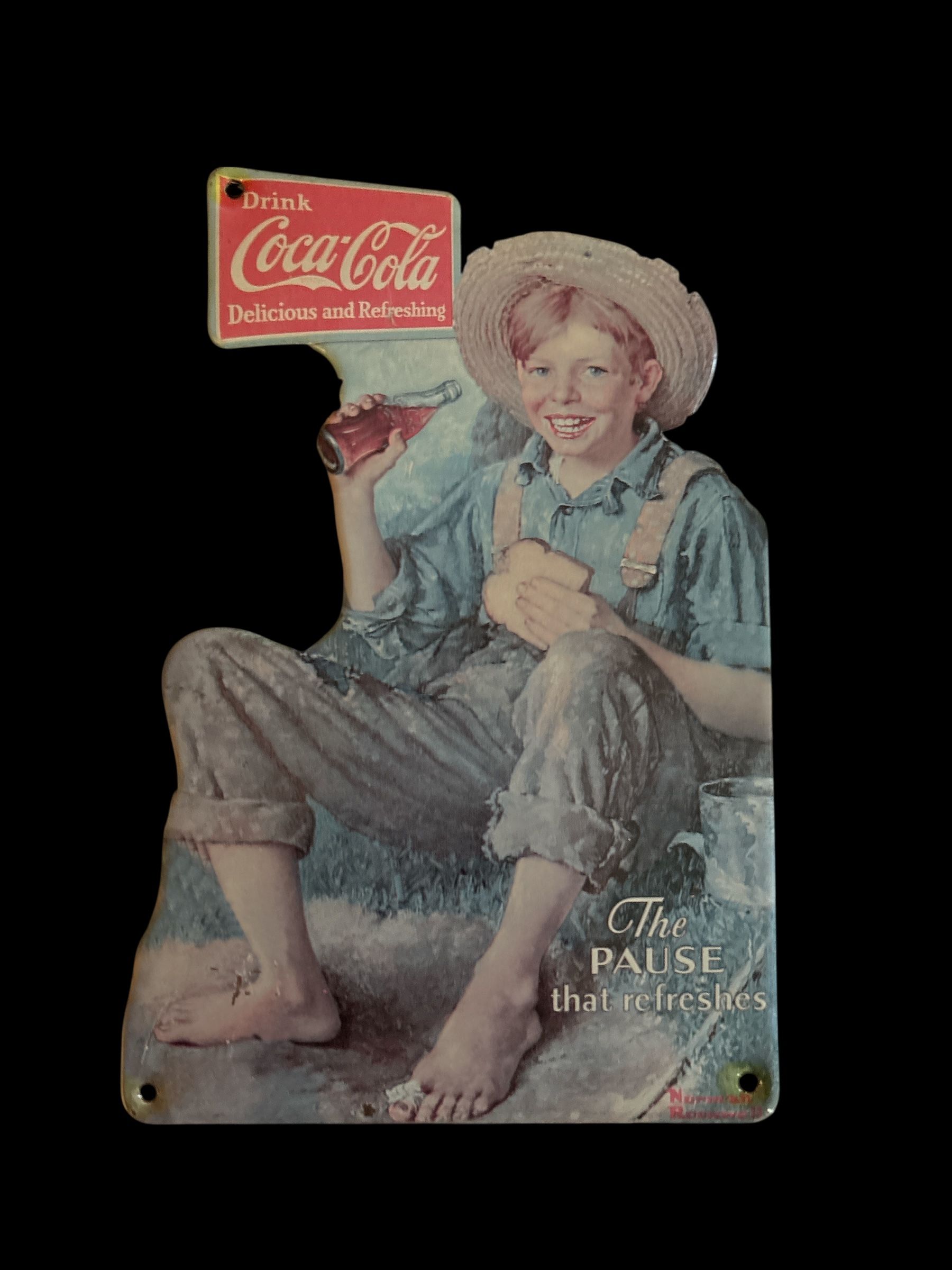 Plaque vintage COCA COLA, illustration de Norman ROCKWELL illustrant le slogan emblématique » la pause qui rafraîchit »